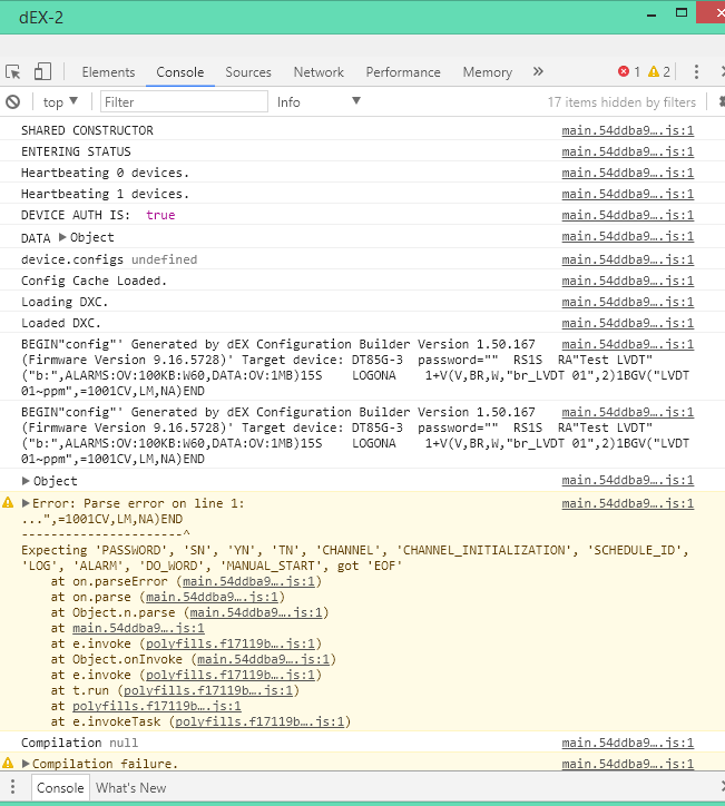 Dear DataTaker experts, I am using DT85G Series 3, and before 2020, It was worked with dEX previous version without any issue. However, as it no longer work with flash player now I have to upgrade it to dEX 2.0 and firmware also upgraded to version 9.22 ![632d319d705b9](serve/attachment&path=632d319d705b9) I have connected the logger using Ethernet cable and add the logger to dEX-2. Now I cannot access the logger through the dEX-2 due to following reasons. 1. It indicated error “DXC Compilation failure” as shown in below screen shot ![632d313c9ca8c](serve/attachment&path=632d313c9ca8c) 2. It requests a username and password even though I never locked the access with any username and password. I have used word “admin” for both username and password as the default one. (I have seen that the default username and password is "admin" in an answer given in the support forum.) But it failed. (refer picture below) ![632d316990685](serve/attachment&path=632d316990685) Could you please help me to solve these issues? Thank you in advance