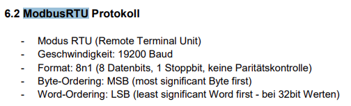 Hello, i want to use a DT85 to query a Modbus RTU Sensor(Meier-NT Soitemperature Probe). From my point of view i did all the necessary configuration but somehow i dont get any response from it. Here is my Setup: Hardware configuration: ``` A-Wire: TxZ B-Wire: RTSy Power: 12V Source Ground: Common Ground with DGND ``` Software configuration: ``` [SERSEN_PORT] *BPS = 19200 DATA_BITS = 8 STOP_BITS = 1 *PARITY = NONE FLOW = NONE *MODE = RS485 *FUNCTION = MODBUS_MASTER ``` I guessed the flowcontroll because it is not clear from the documentation of the sensor Reference from Sensor documentation(german): ![647898b8c927b](serve/attachment&path=647898b8c927b) I know that the sensor is working since when i connect it the same way to another datalogger(Meier-NT ADL-MX) it works. Here is the output when trying to query the sensor with P56=4: ``` DT85> 1modbus(ad2,R3:30003) 1modbus(ad2,R3:30003) Modbus TX >SS: 02 04753200018a3a (8) Modbus timeout dataTaker 85 E124 - Modbus transaction failed 1MODBUS NotYetSet ``` Is there any other way to debug or am i doing something wrong?