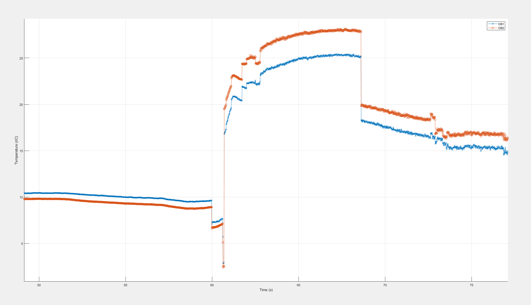 I have attached a graph showing two jumps, one at around 61 s the other at around 68 s. For reference the temperature should be 10 dC and doesn't change over time.